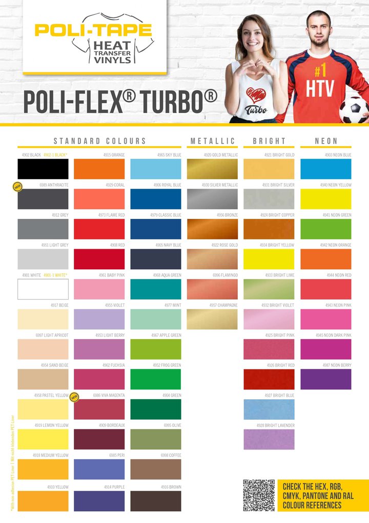 POLI-FLEX® TURBO je vhodný na textílie ako nylon, bavlna, polyester, zmesi polyester/bavlna a polyester/akryl.