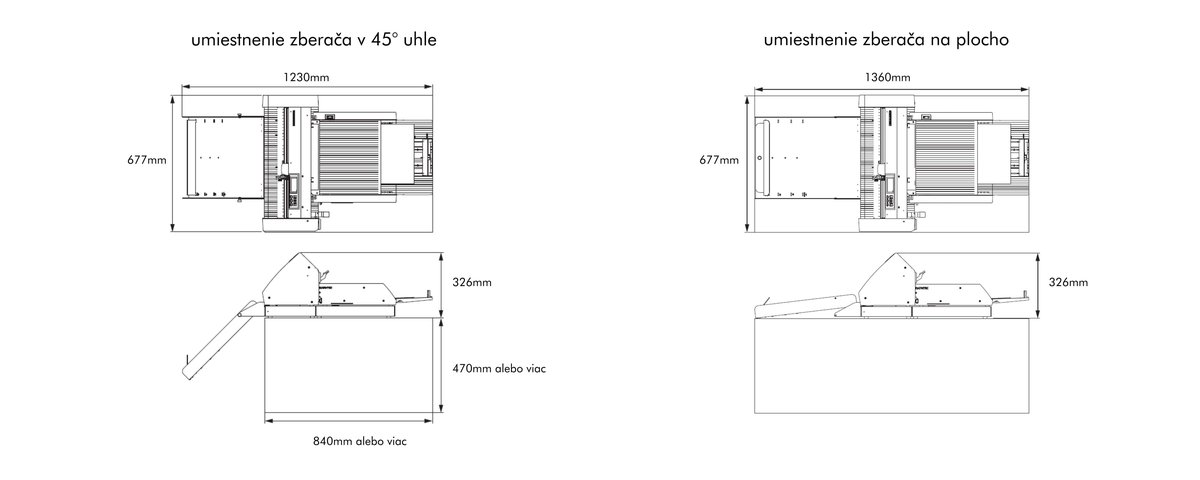 | Rozmery (š x h x v) | pri 45 stupňovom uhle zberača: 677 x 1230 x 326mm pri rovnej polohe zberača: 677 x 1 360 x 326mm |