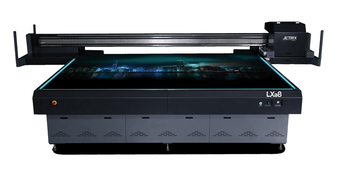 UV tlačiareň JETRIX LXa8 LED je flatbetová tlačiareň s pracovnou plochou 3,2 x 2,05 m. Je to vylepšená verzia populárneho modelu JETRIX LXi8 od spoločnosti InkTec a dosahuje rýchlosť presahujúcu 222 m²/h.