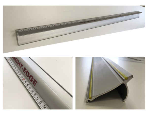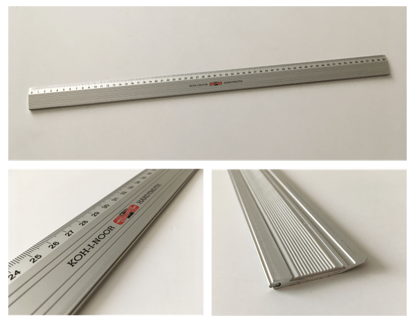 Hliníkové pravítko s kovovou lištou proti zarezaniu. V spodnej časti pravítka je žliabok s protišmykovou gumou.