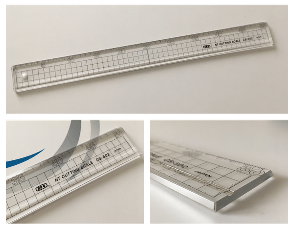 Priesvitné pravítko s pomocnými štvorčekmi pre lepšie odrezávanie, z vrchnej časti kovový pásik proti poškodeniu pri rezaní.